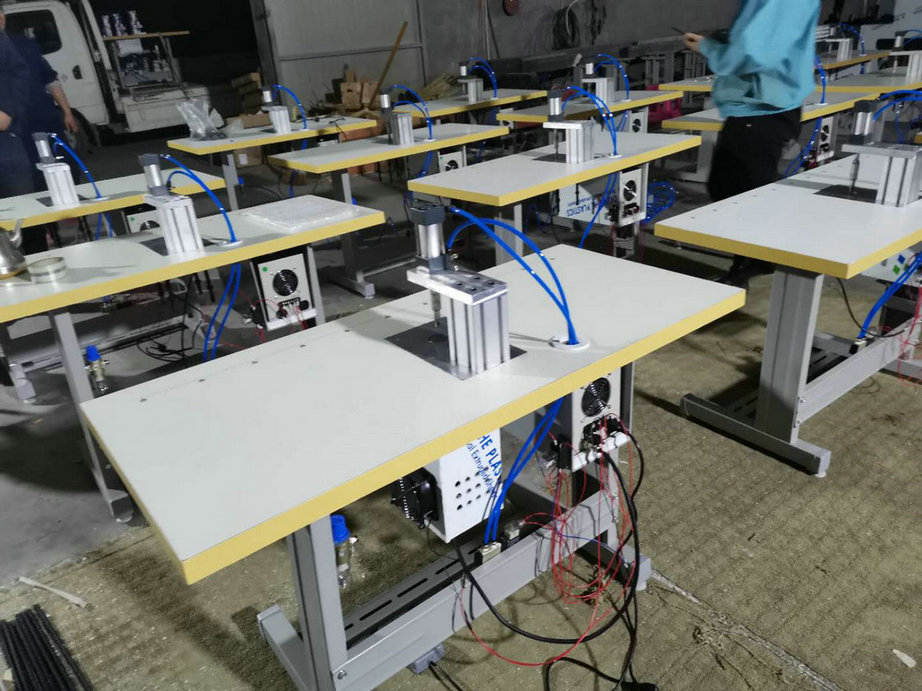 本機(jī)以超聲波將綁帶融合于口罩本體兩側(cè),進(jìn)而完成綁帶式口罩成品,只需一名操作員將口罩片置于超聲波發(fā)生器的頭上,后將綁帶放在口罩片上,腳踏踏板使氣缸向下運(yùn)動(dòng),縫住綁帶和口罩片。
